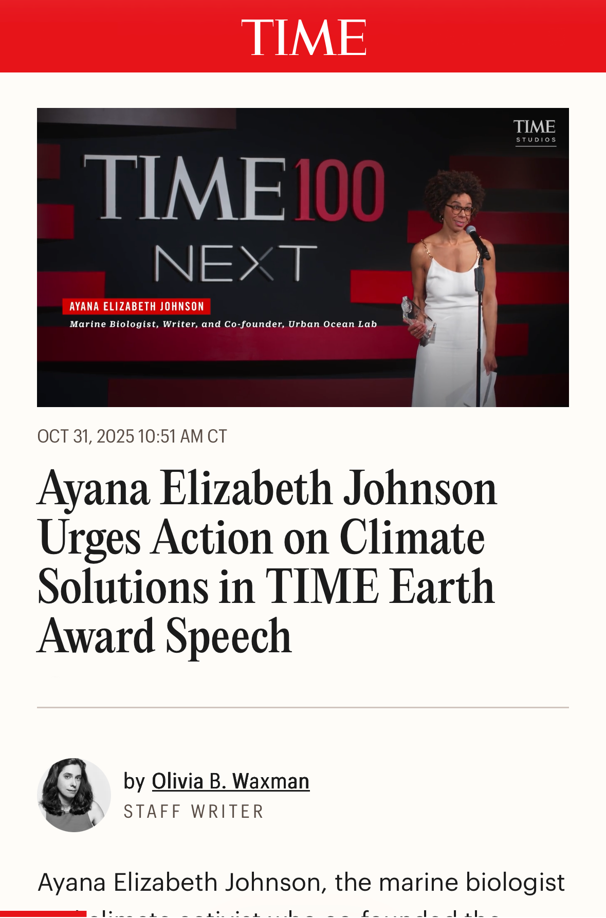 • TIME: Ayana Elizabeth Johnson Urges Action on Climate Solutions in TIME Earth Award Speech